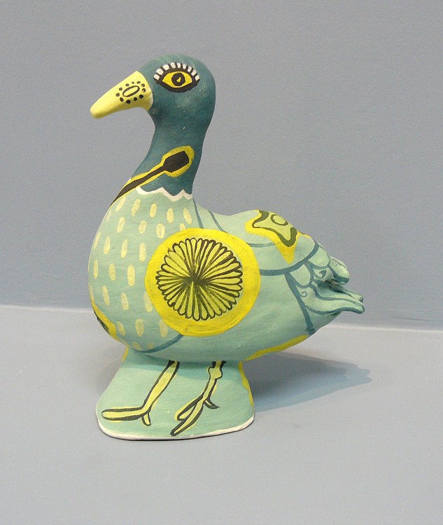 The different styles of object in the exhibition carry different ecosystem participants. Each of the plates serves up a species of phytoplankton. The vases are the water carriers in the system. The two bird sculptures are stickered with motifs indicating that all creatures share the waterways. Nature is feral and moves across the boundaries of all these containers and agents. -Marion Familton