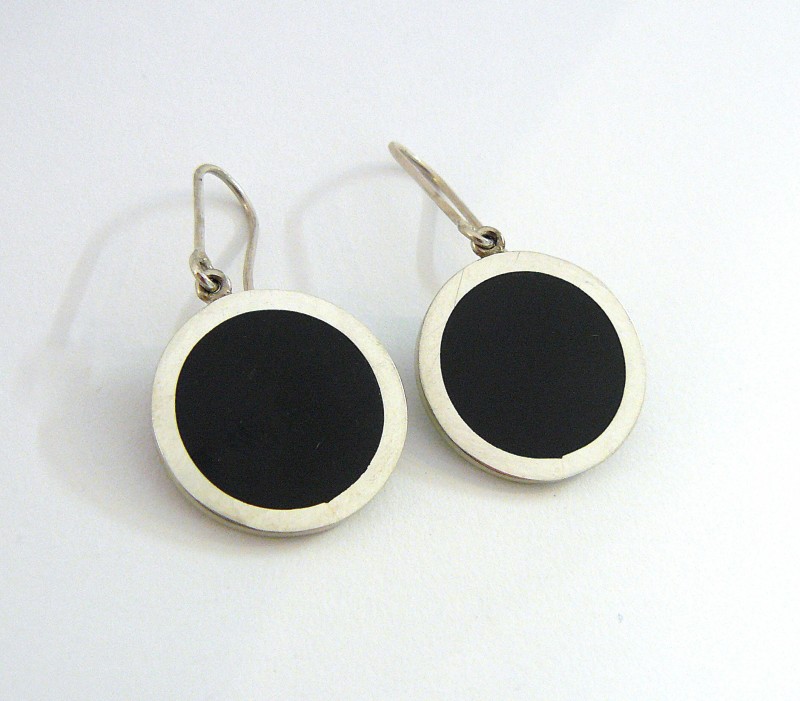 Disc earrings, sterling silver and basalt.