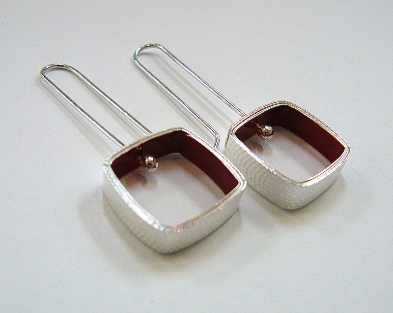 Wrap earrings, squares with red. Sterling silver & enamel paint.