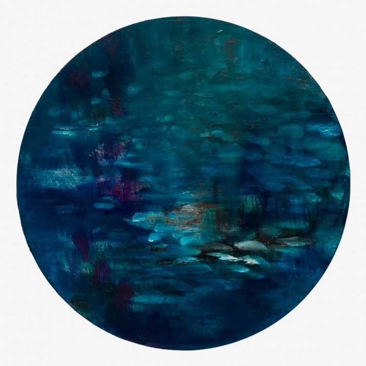 Blue Haze, a large tondo (circle-shaped painting), is moonlit. Here, the banks of a river are only implied, they gradually colour into luminous bodies of land. Brown weeds and rocks or white water whisper in the foreground. That rare thing – a figureless landscape without fences and trees, this work has a nocturnal allure. Diffuse and transporting, it lulls the viewer into its generous, lento pace.
