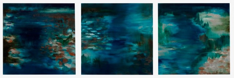 Aside from halves, Hoedemakers also tilts our gaze to moody riverbeds. In the triptych, Tangible Dream, the horizon is limited to the top seventh of the boards, to tremendous effect: the weather looms; our vision is localised. Absent of birds, these landscapes reveal the relationships between plants, rocks, water and weather. These relationships amount to a wholeness, paramount perhaps to the sanctuary Hoedemakers intends her paintings provide.