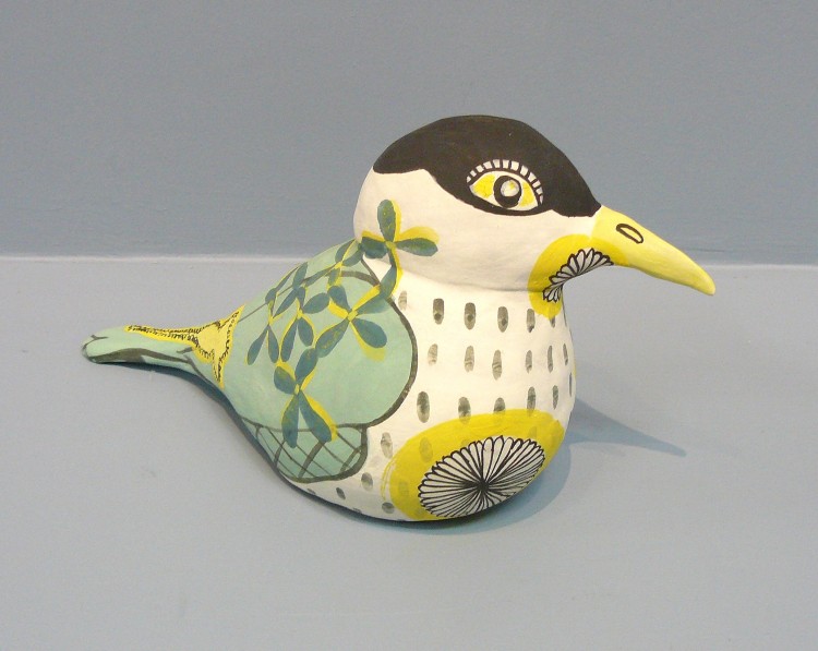 The different styles of object in the exhibition carry different ecosystem participants. Each of the plates serves up a species of phytoplankton. The vases are the water carriers in the system. The two bird sculptures are stickered with motifs indicating that all creatures share the waterways. Nature is feral and moves across the boundaries of all these containers and agents. -Marion Familton