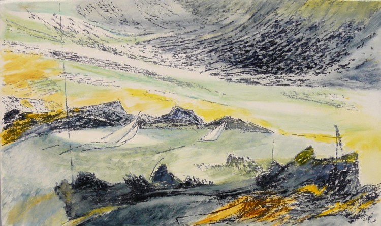 The drawn and painted images in this exhibition are developed from sketchbook pages made on site during excursions into hills and mountains, along coastlines and into steep places.