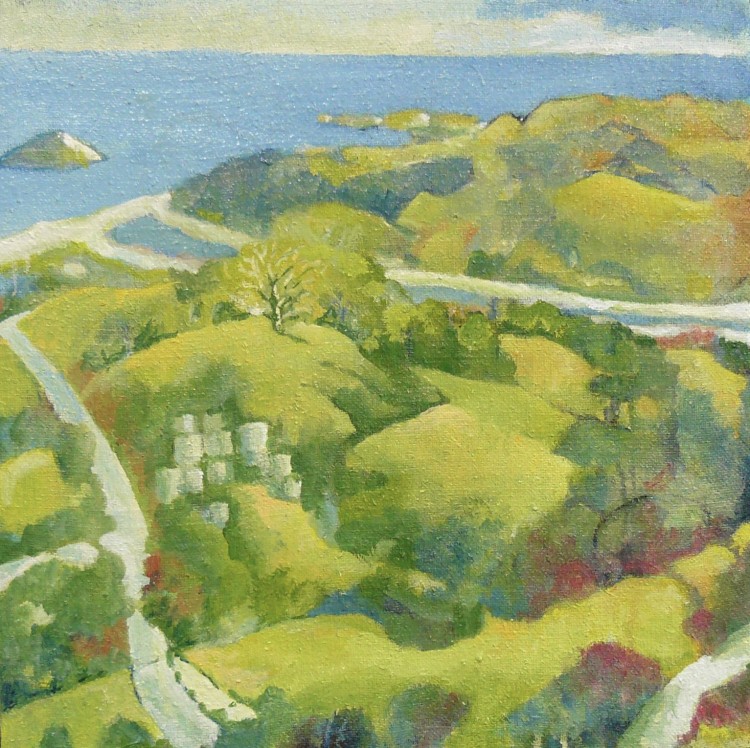 He has focused on the lush green hillsides with occasional glimpses of the Pacific Ocean. Winding country roads invite us in, and it is easy to imagine travelling across these soft rolling hills – a nod to Grant Wood’s influence on Rodney’s paintings.